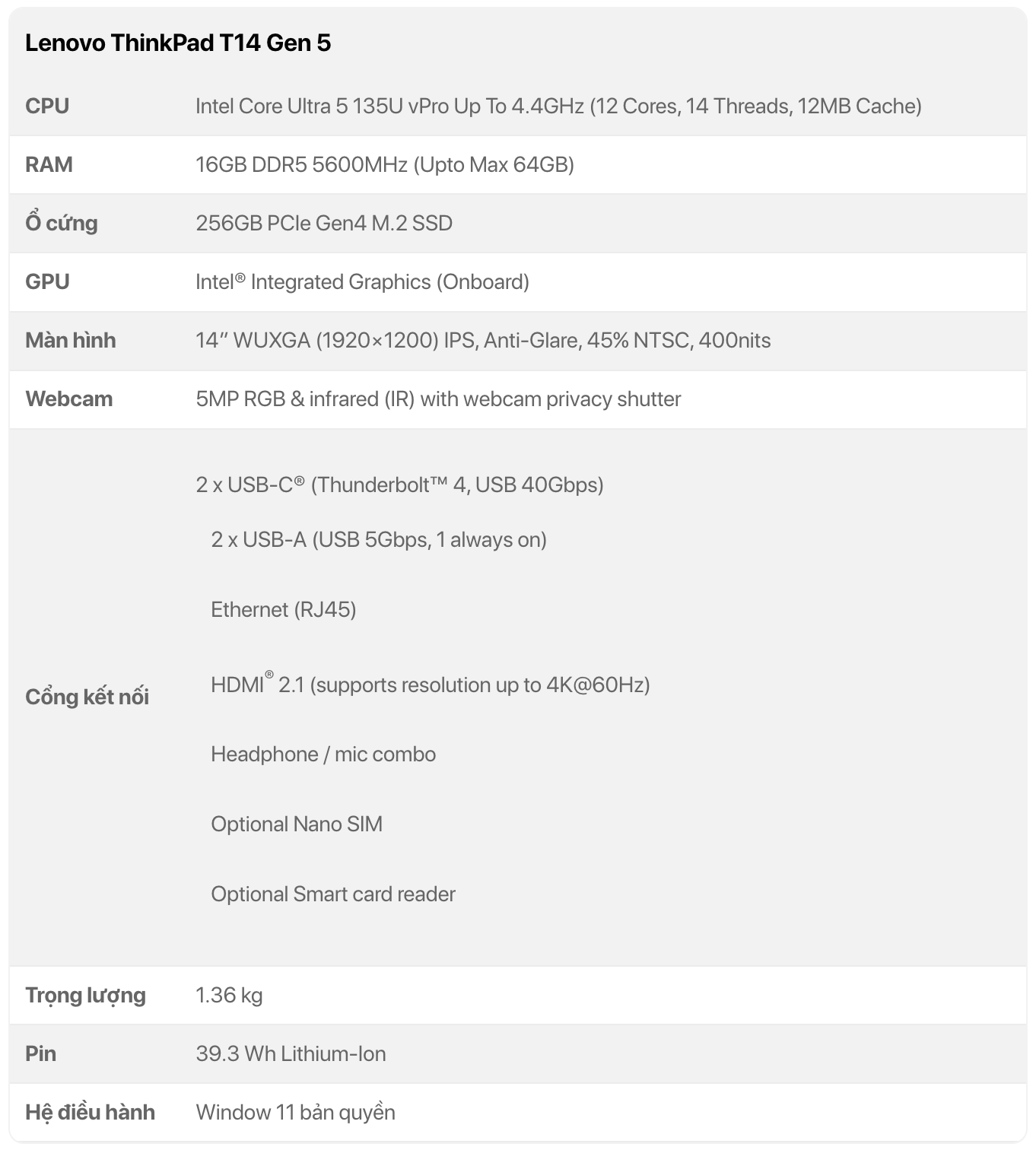 Màn hình 14.0'' WUXGA (1920 x 1200) IPS, anti-glare, 300 nits