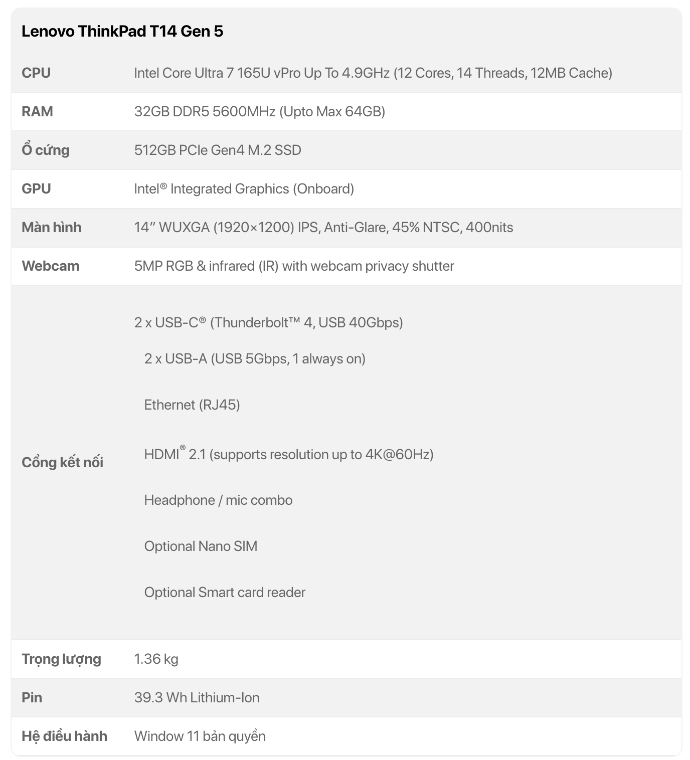 CPU Core Ultra 7 165U ( 12 lõi 14 luồng Turbo tối đa 4.9 GHz )
